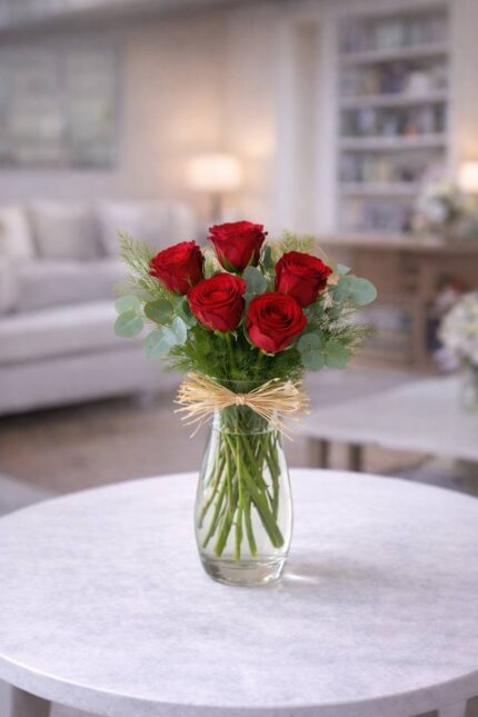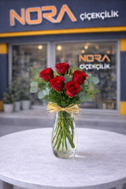 Kristal Vazoda 5 Kırmızı Gül
