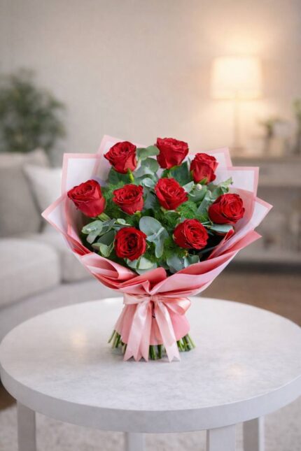 Pembe Bukette 9 Kırmızı Gül