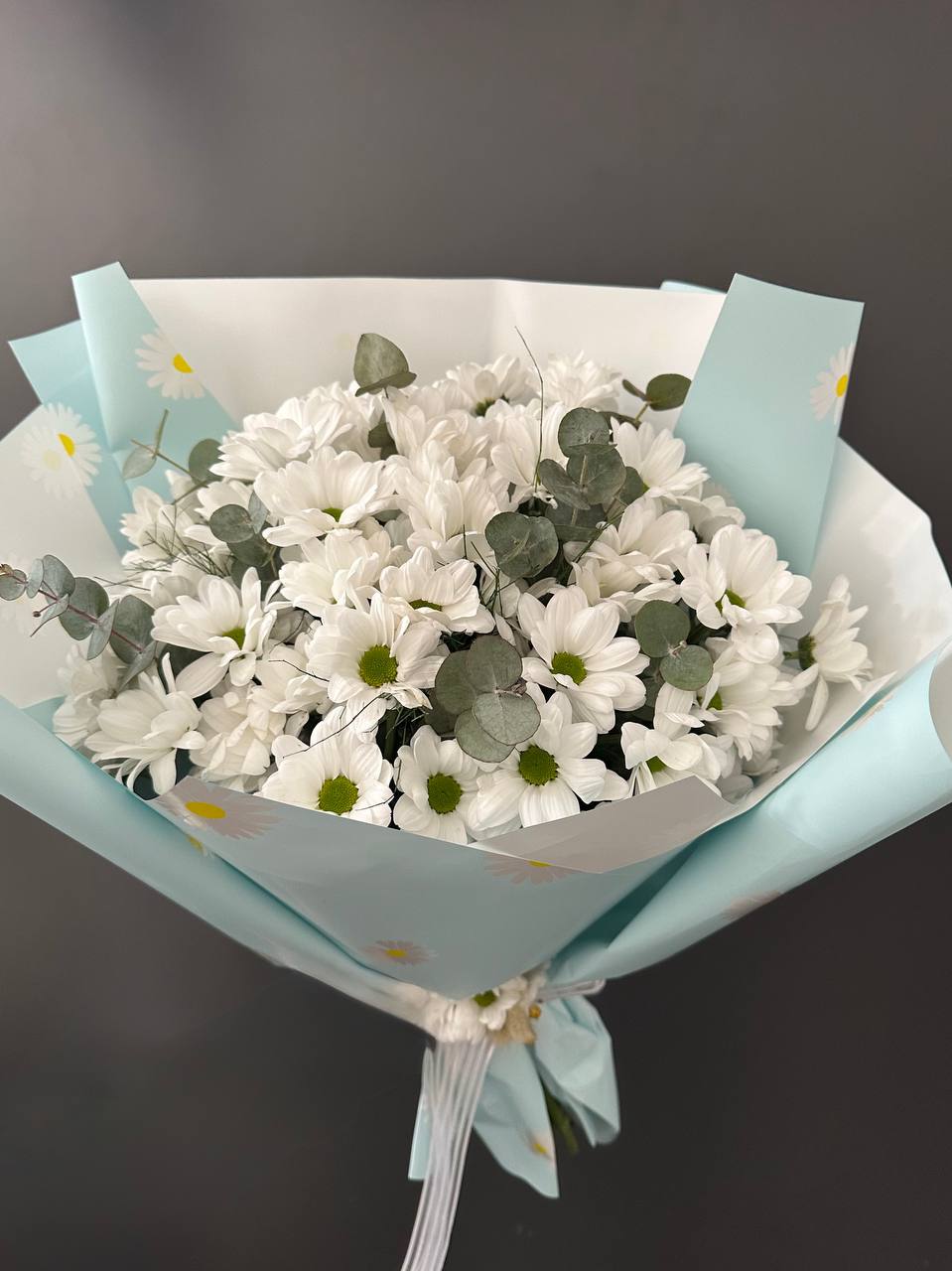 Mavi Buket Kağıdında Beyaz Papatya Buketi